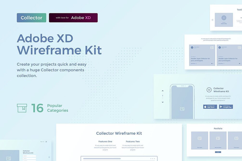Collector Wireframe Web Kit - is a stylish collection of wireframe design layouts that consists of 15 popular categories for your projects. This collection is made for the popular and rapidly developing Adobe XD that would speed up and facilitate your work with prototyping your projects and revitalize them in the future.